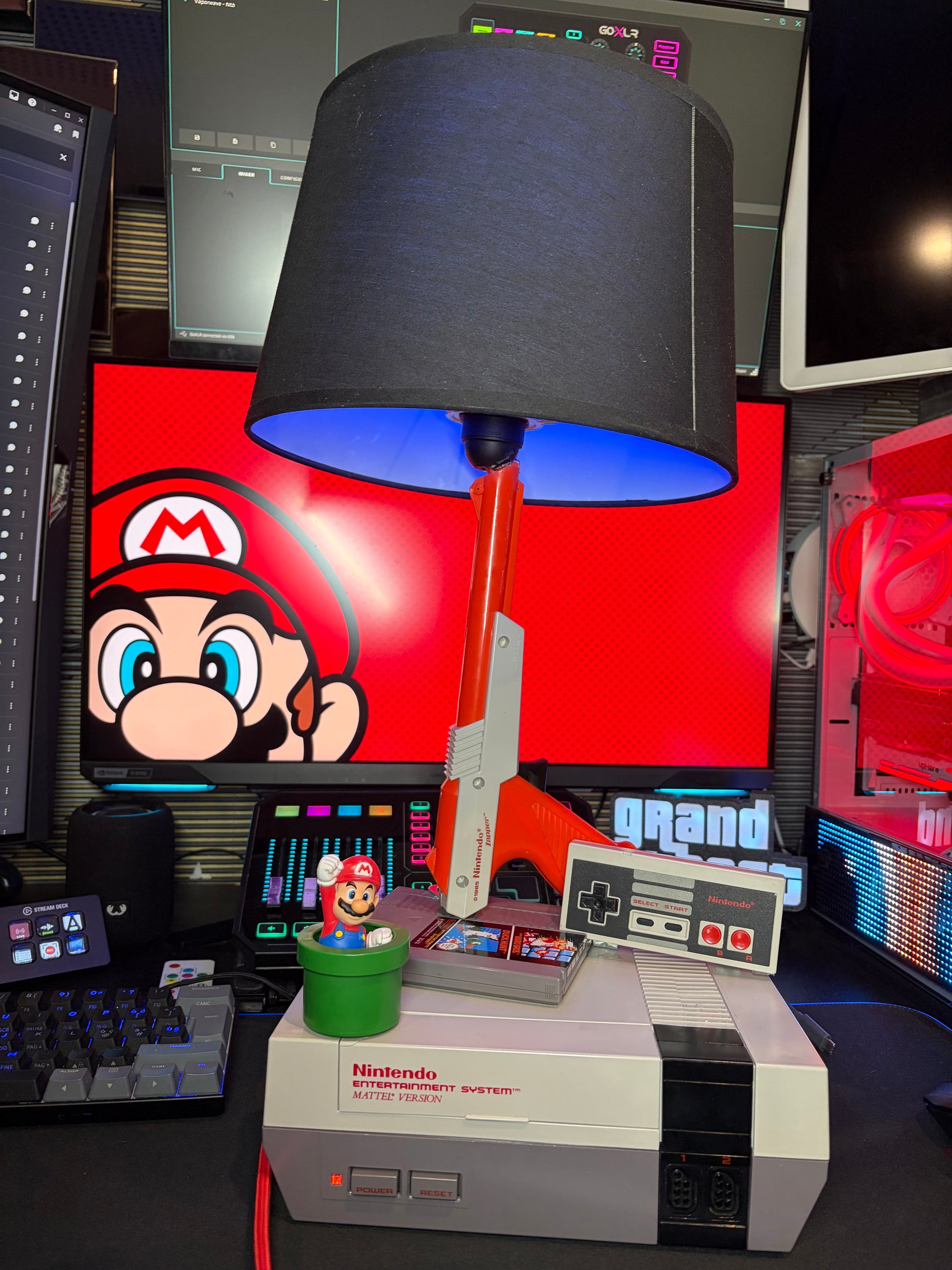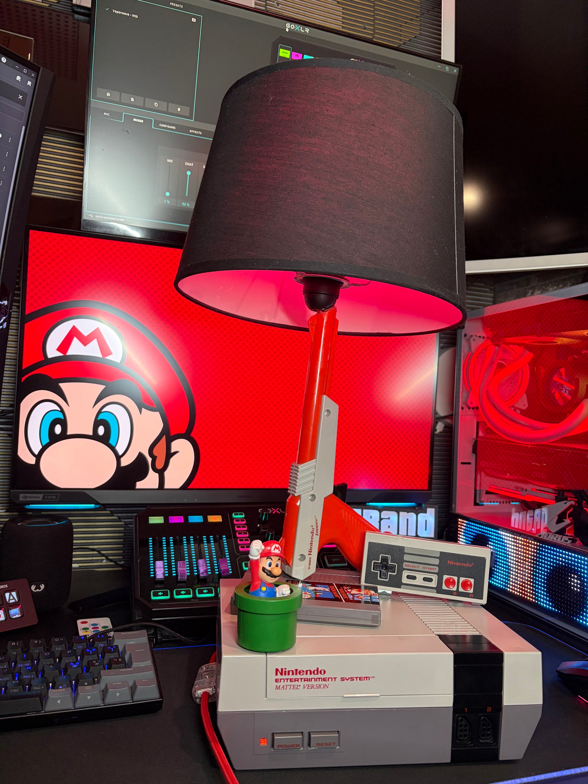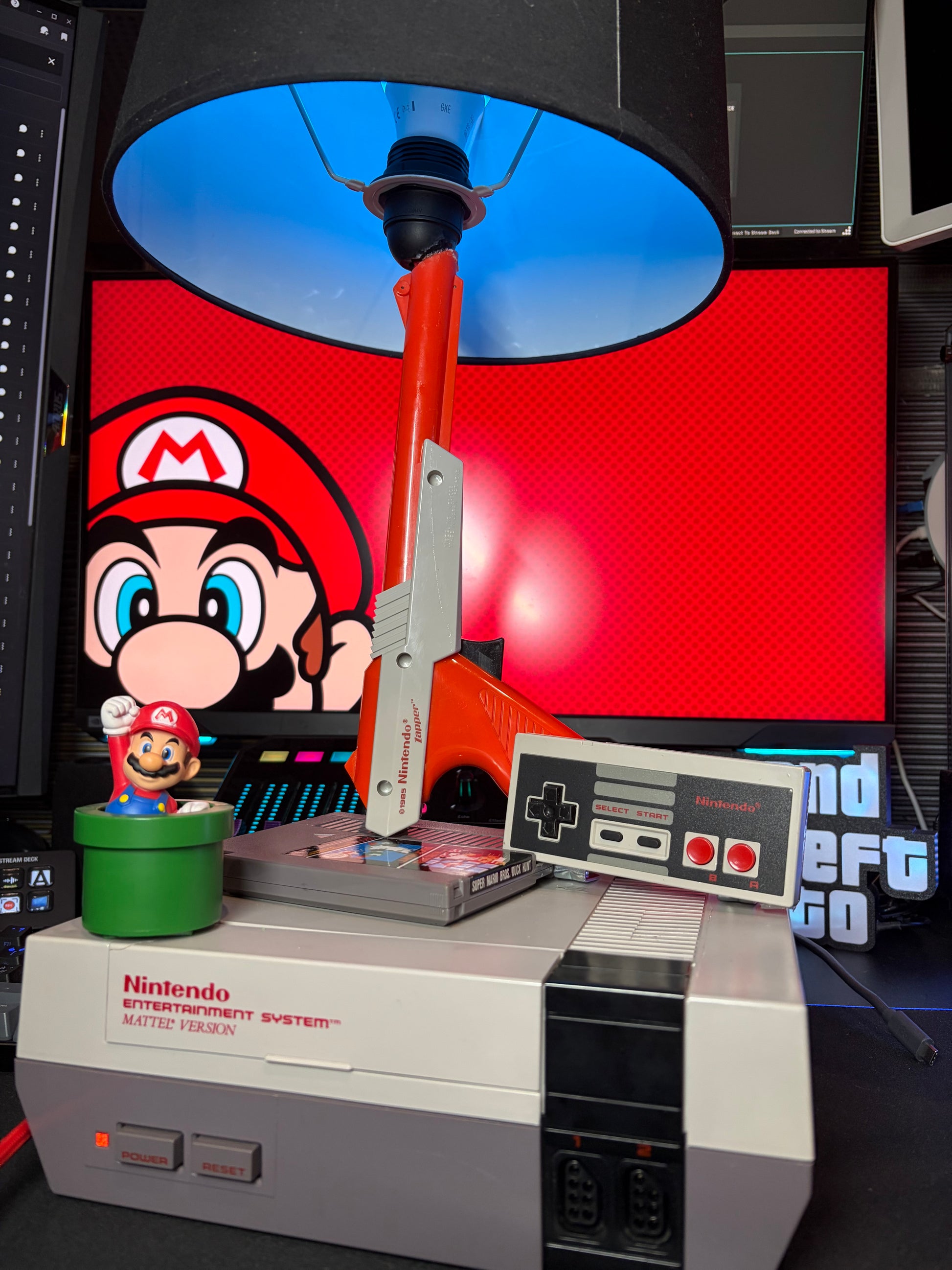 Lampada da tavolo con base composta da Nintendo Entertainment System originale, con controller Nintendo e Nintendo Zapper integrati nella struttura.